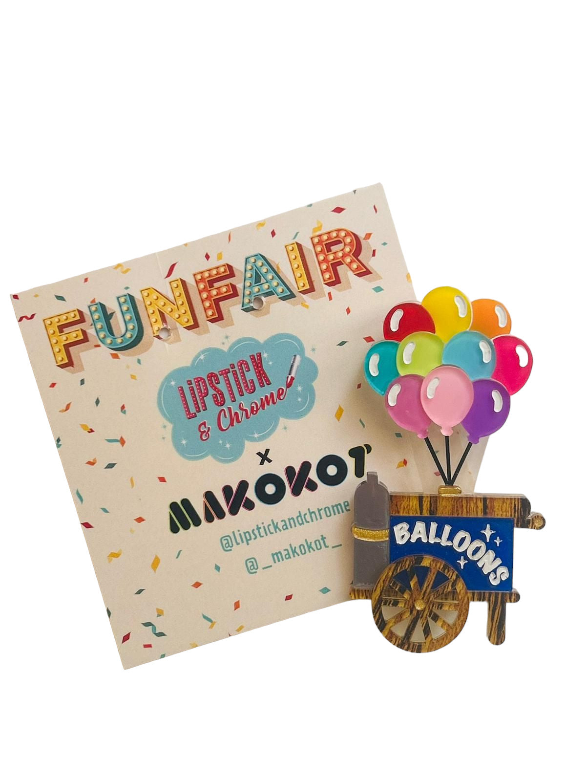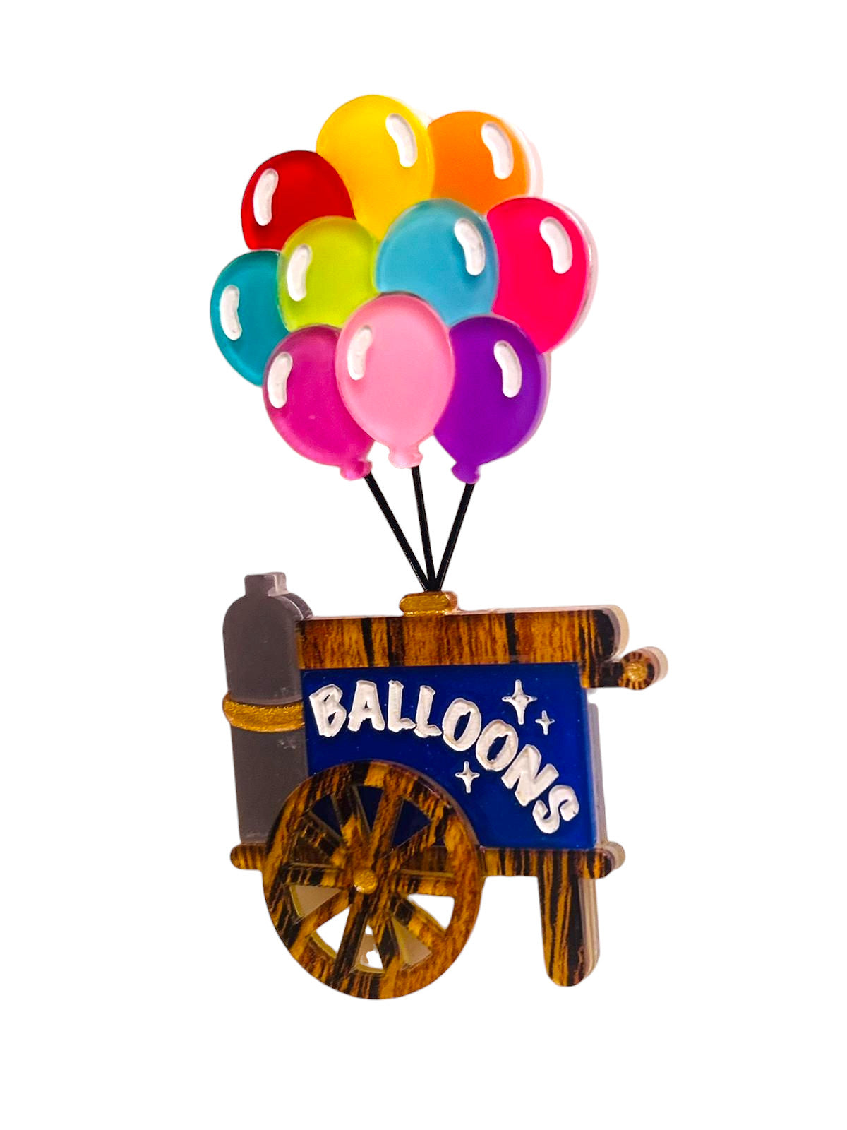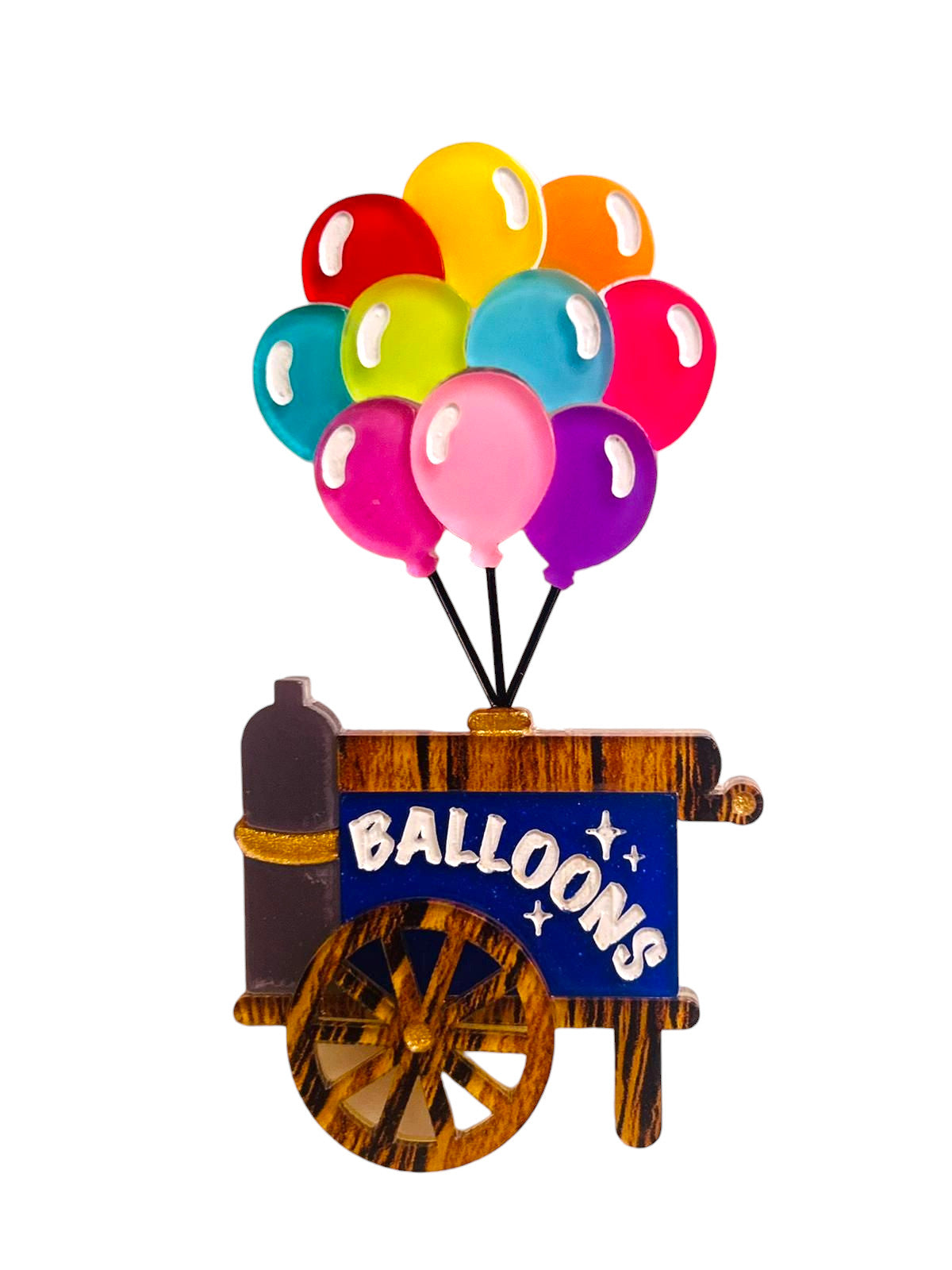 Ecco il primo pezzo della nostra collaborazione con le fantastiche ragazze di Lipstick & Chrome: Il nostro bellissimo carretto dei Palloncini! Questa spilla è composta da due lastre di acrilico/acetato. La base è trasparente. Le incisioni sono riempite con colori acrilici.