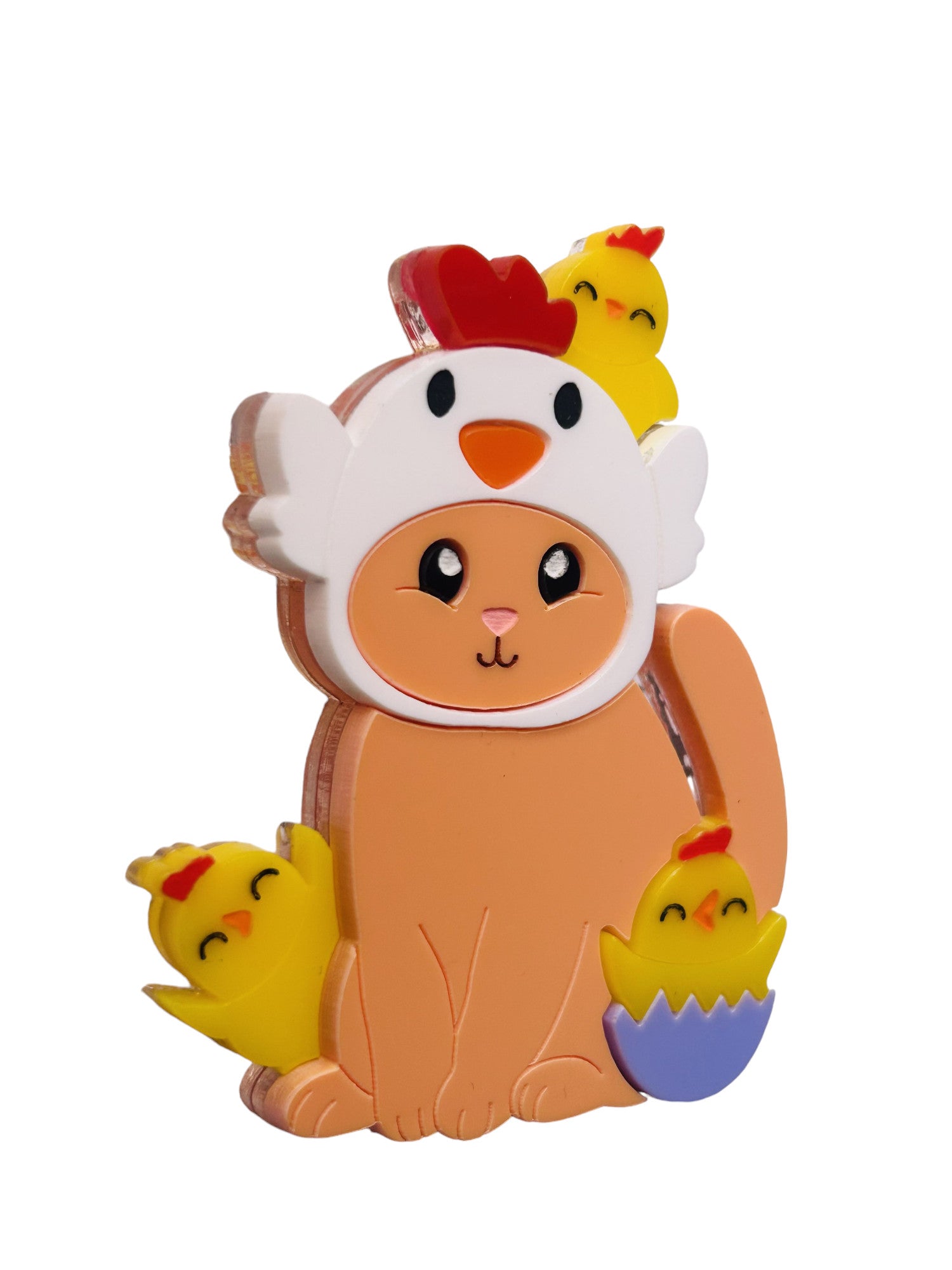 Questa spilla è composta da tre lastre di acrilico/plexiglas. La base è trasparente. Le incisioni sono riempite con colori acrilici.