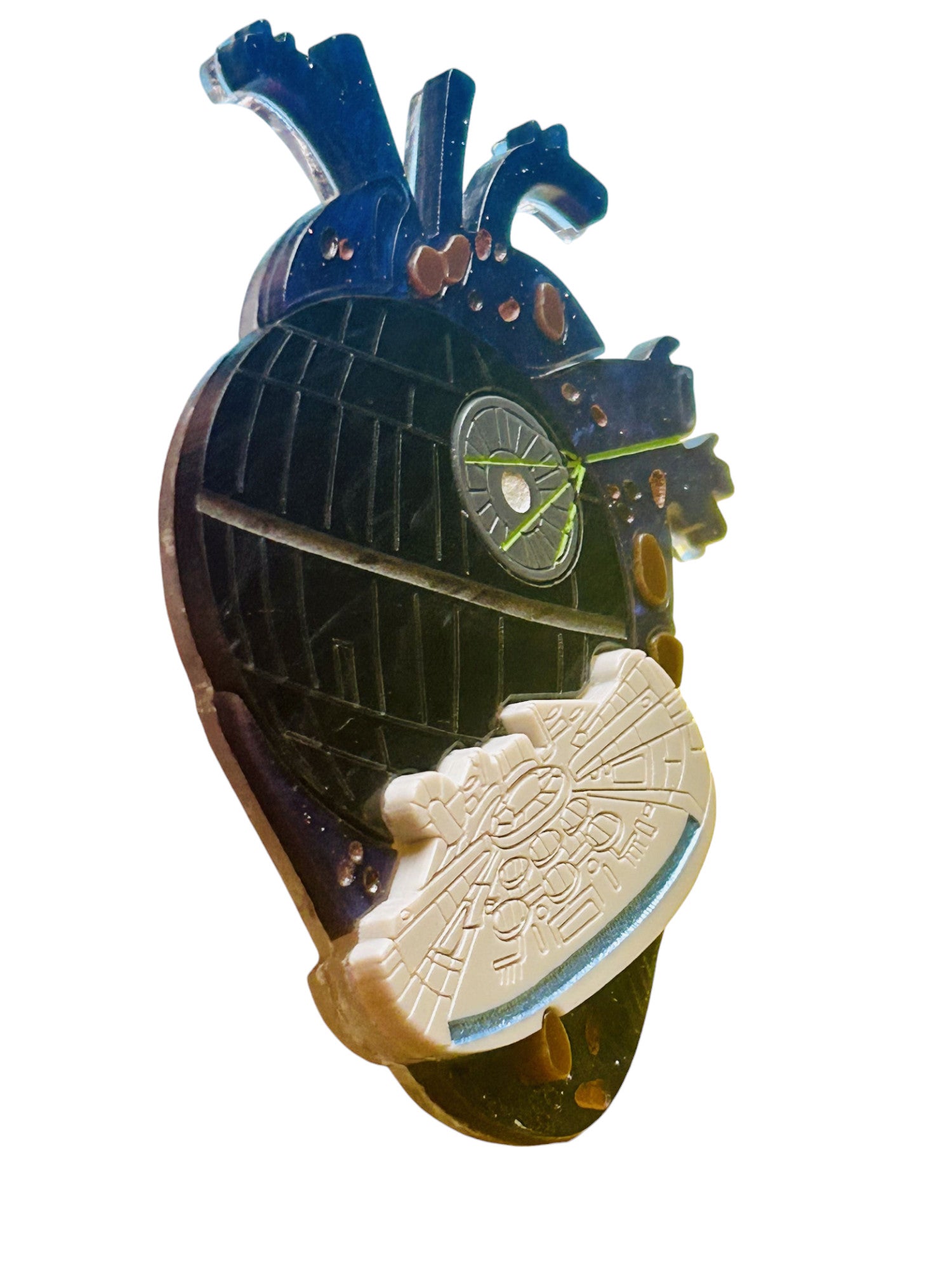 Questa spilla è composta da tre lastre di acrilico/plexiglas. La base è trasparente. Le incisioni sono riempite con colori acrilici.