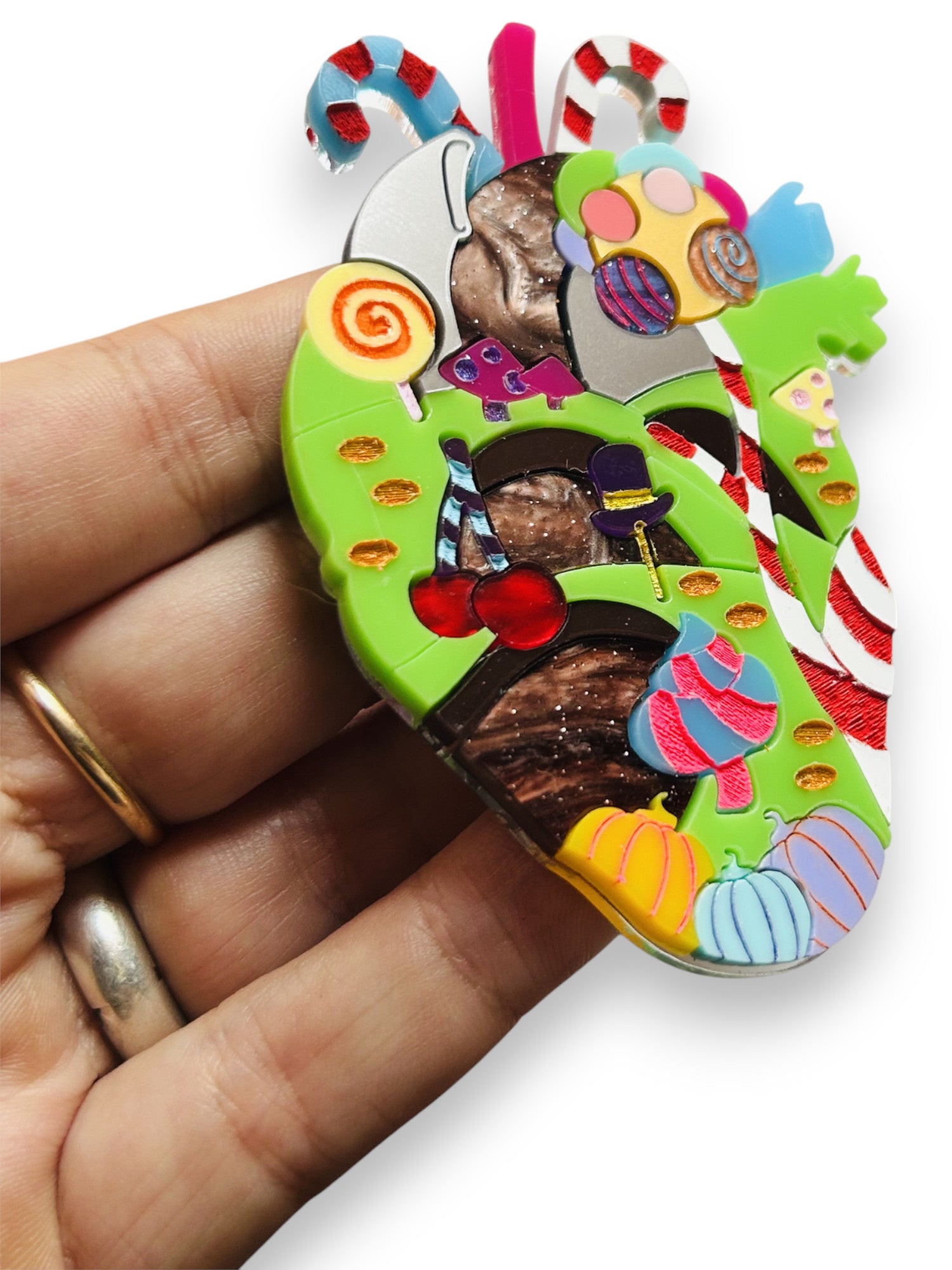 Questa spilla è composta da due lastre di acrilico/plexiglas. La base è trasparente. Le incisioni sono riempite con colori acrilici.