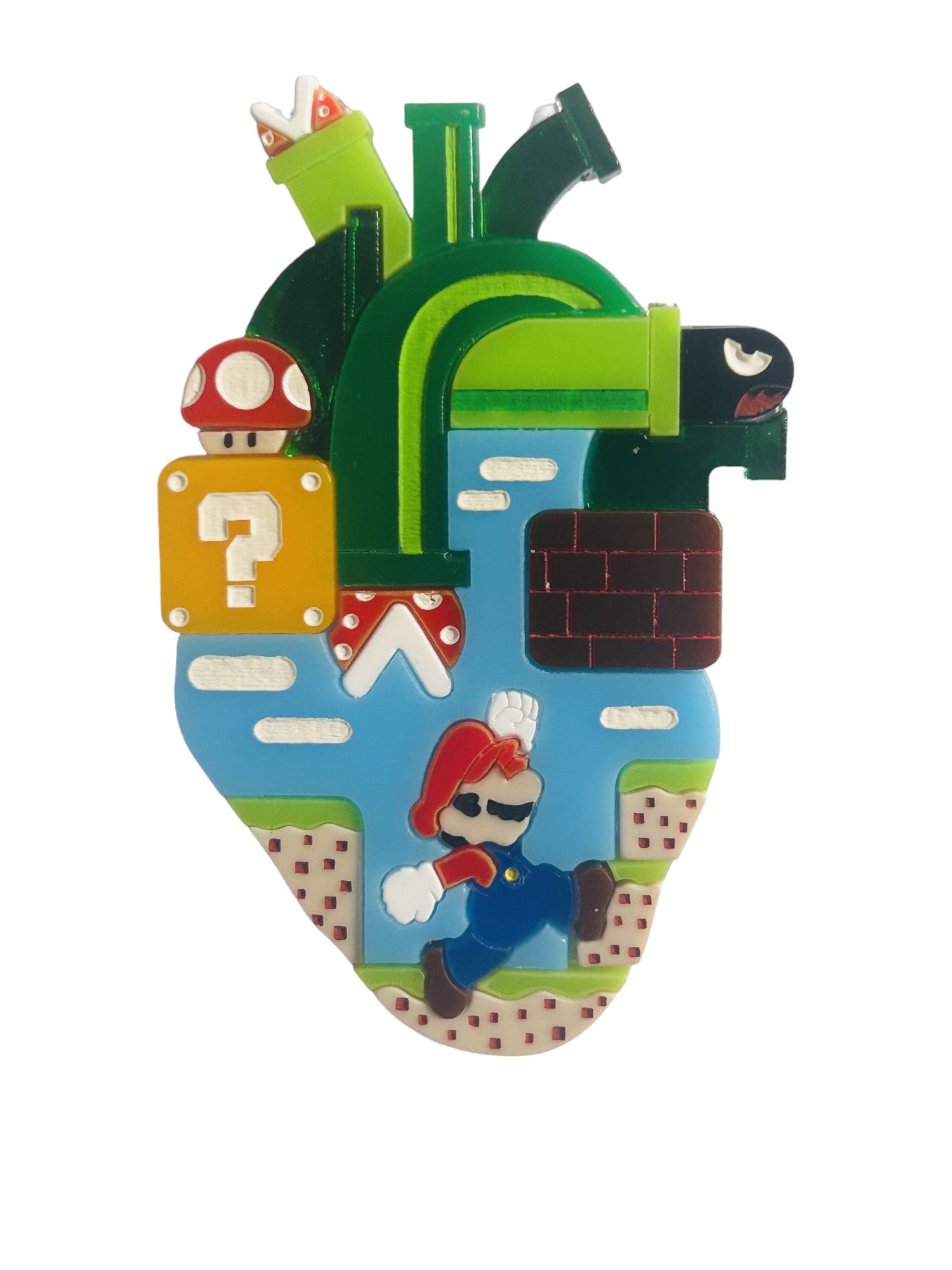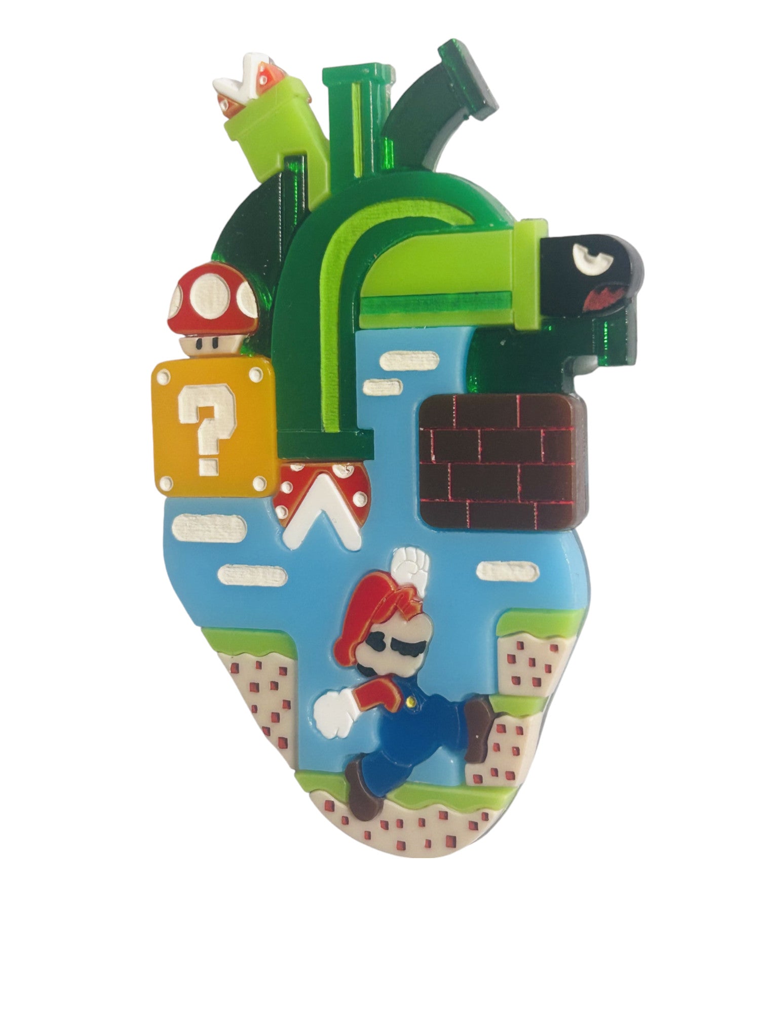 Questa spilla è composta da due lastre di acrilico/plexiglas. La base è trasparente. Le incisioni sono riempite con colori acrilici.