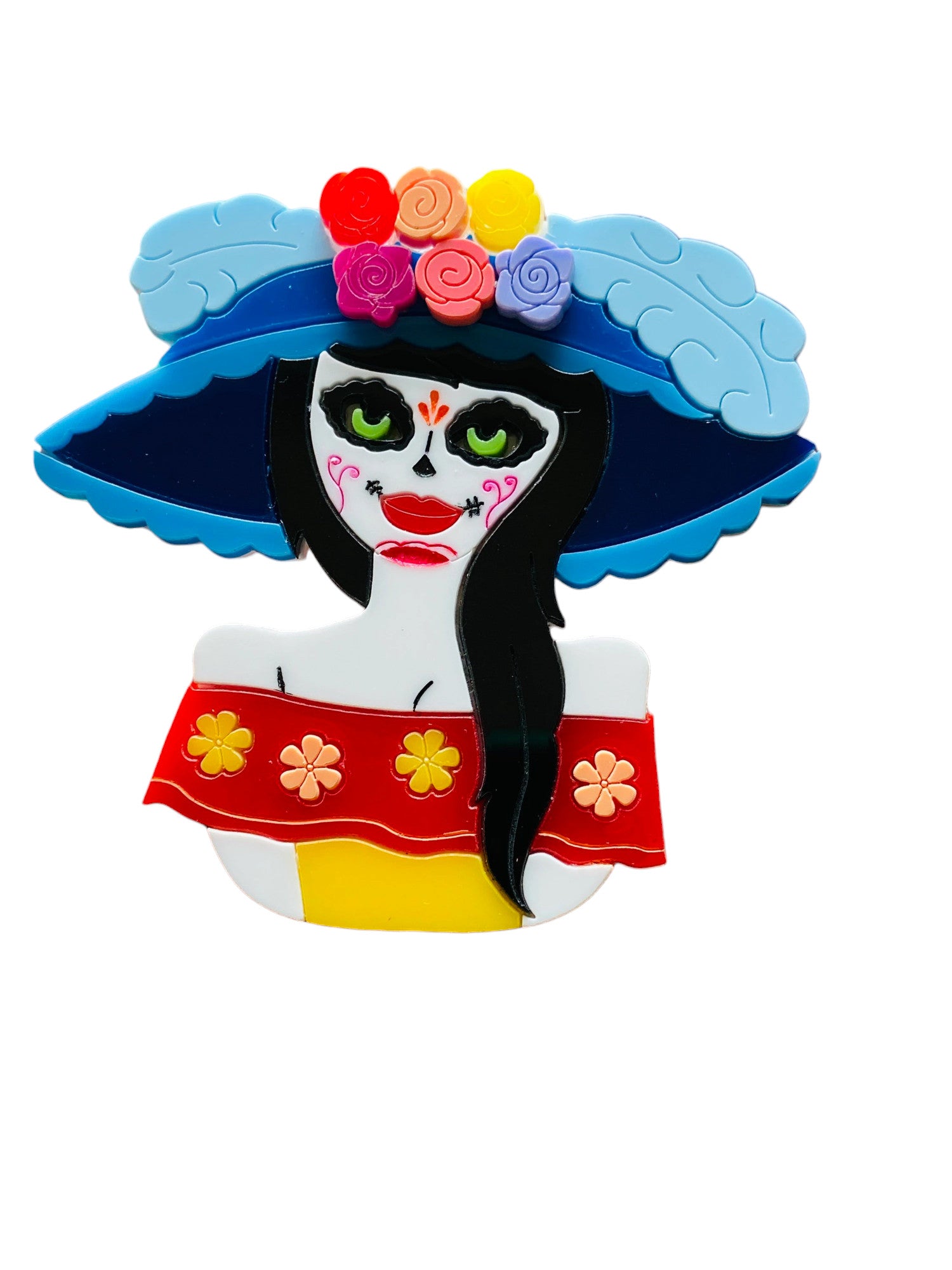 Questa spilla è composta da due lastre di acrilico/plexiglas con dettagli in terzo livello. La base è trasparente. Le incisioni sono riempite con colori acrilici.