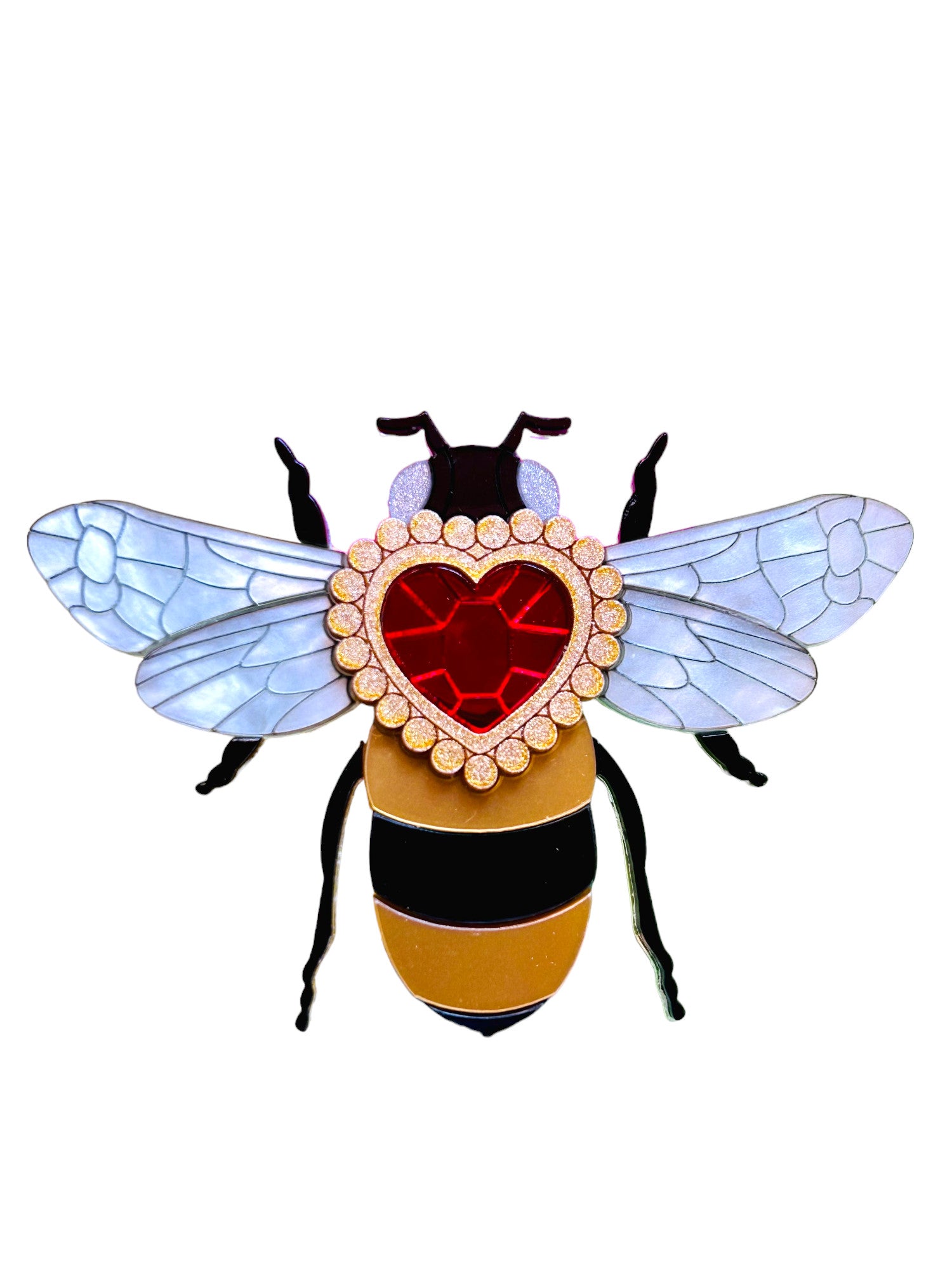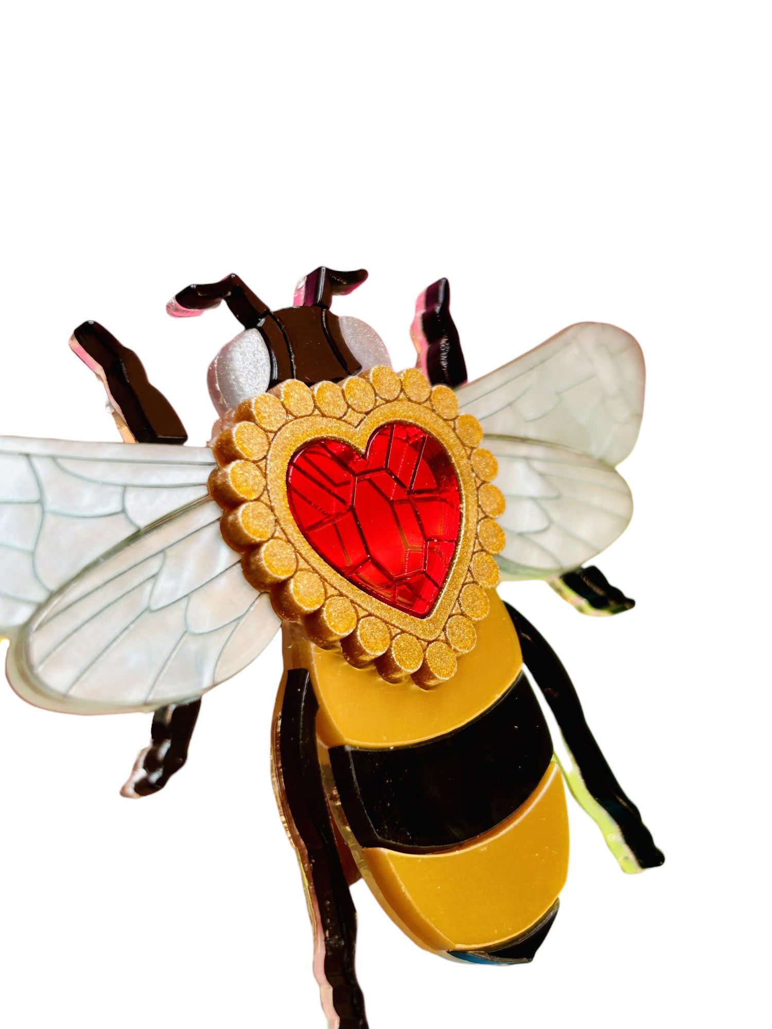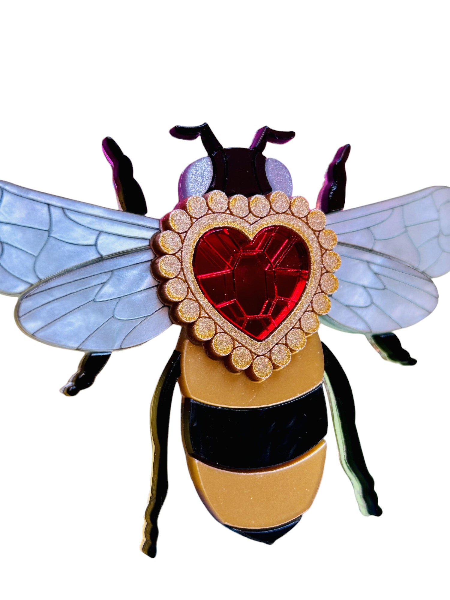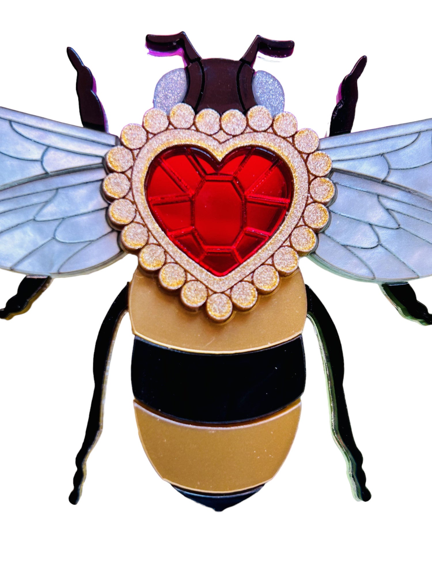 Questa spilla è composta da due lastre di acrilico/plexiglas. La gemma al centro è in terzo livello. La base è trasparente. Le incisioni sono riempite con colori acrilici.