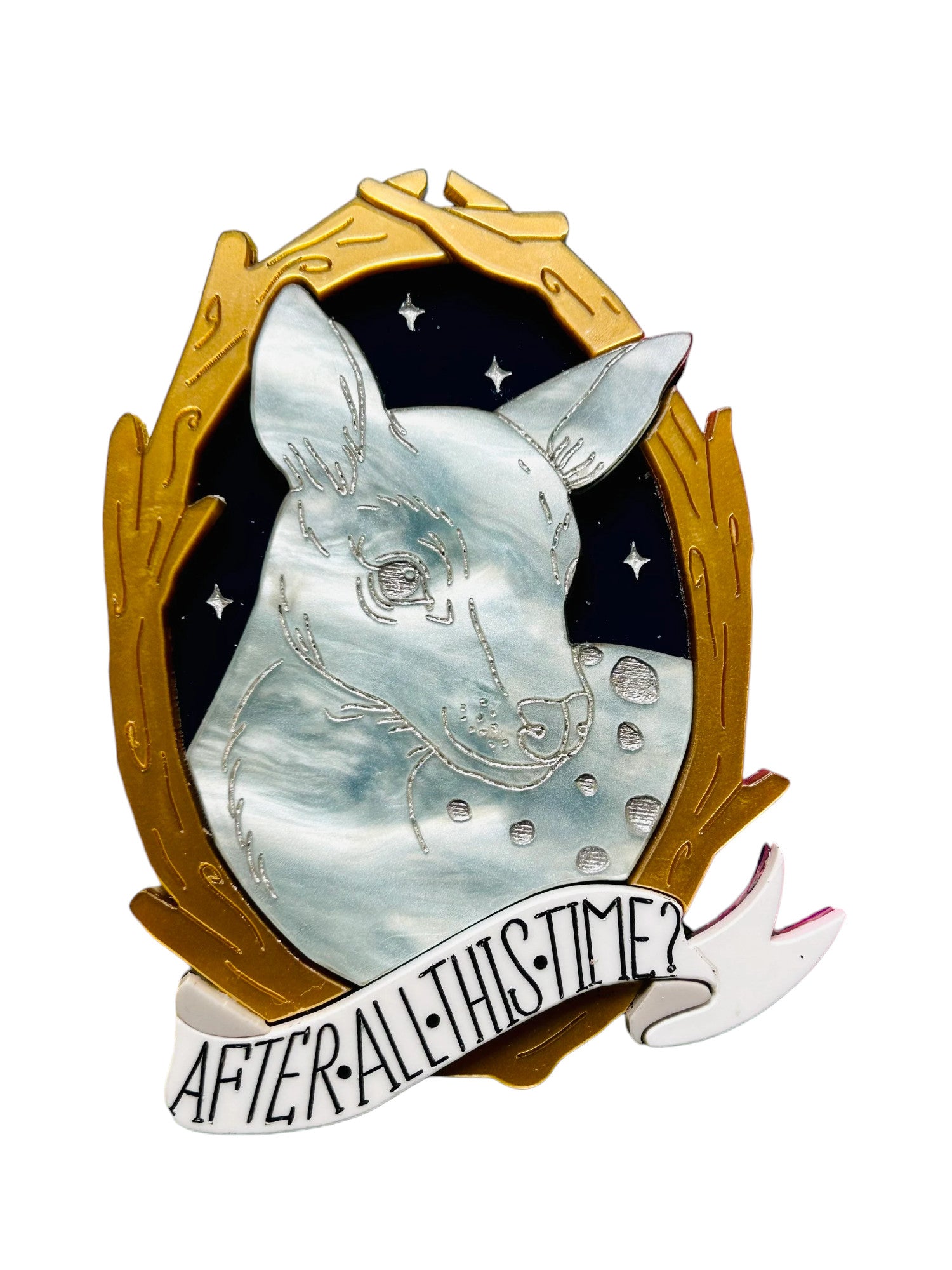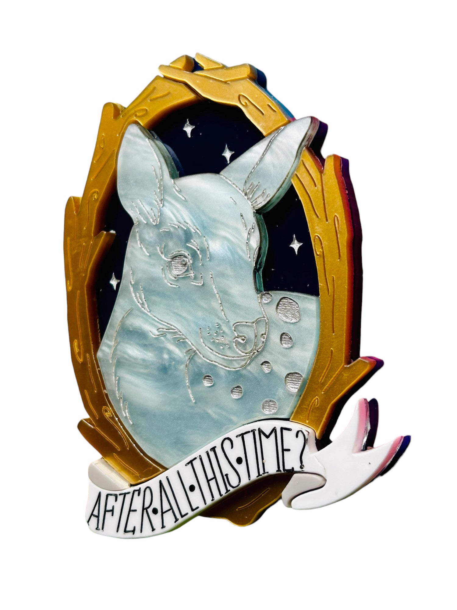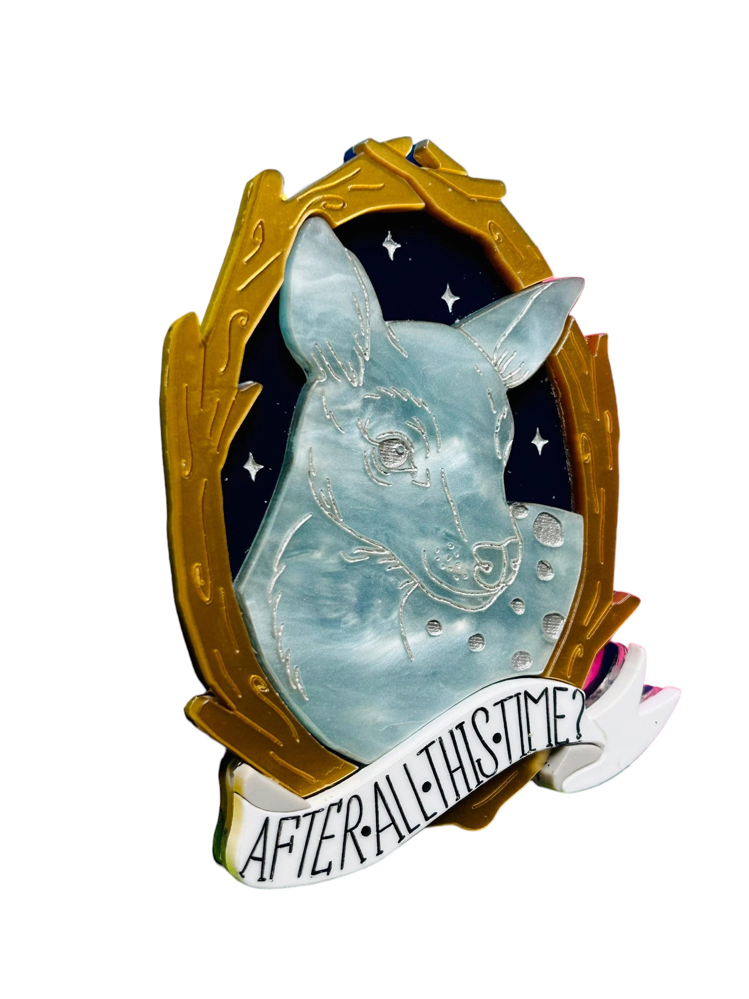 Questa spilla è composta da due lastre di acrilico/plexiglas. La base è blu. Le incisioni sono riempite con colori acrilici.