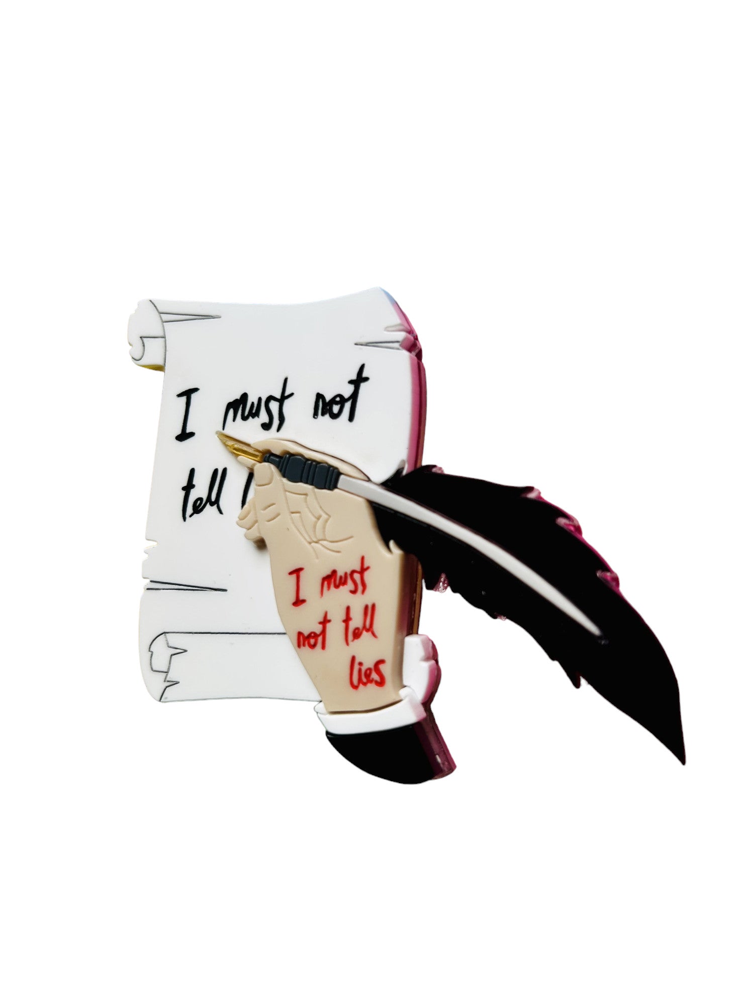Questa spilla è composta da due lastre di acrilico/plexiglas, con dettagli in terzo livello. La base è trasparente. Le incisioni sono riempite con colori acrilici.