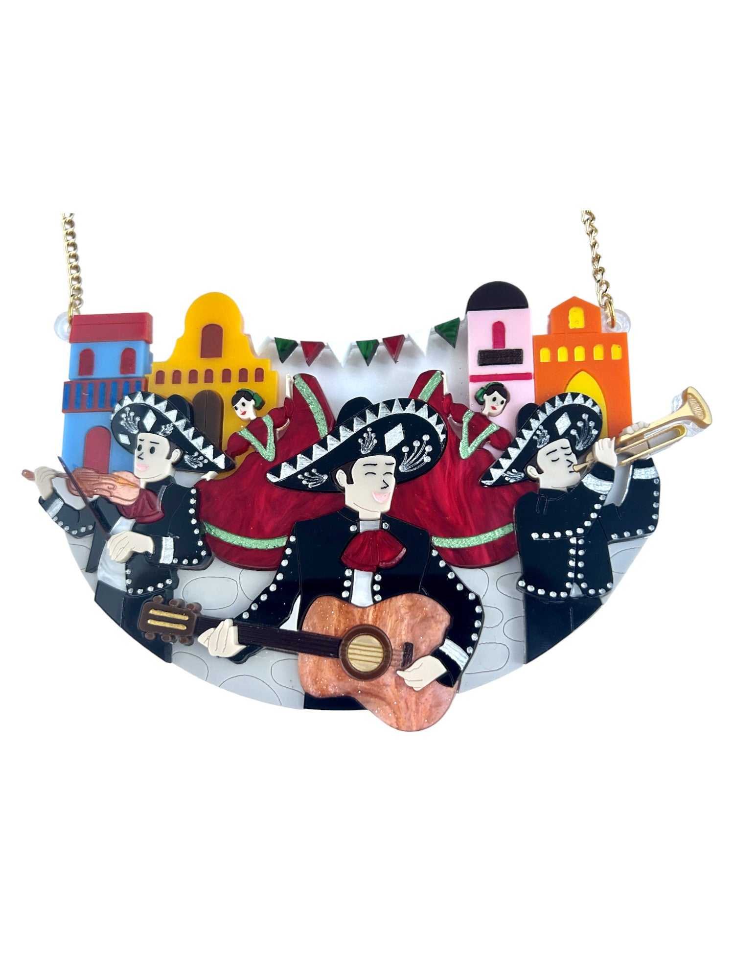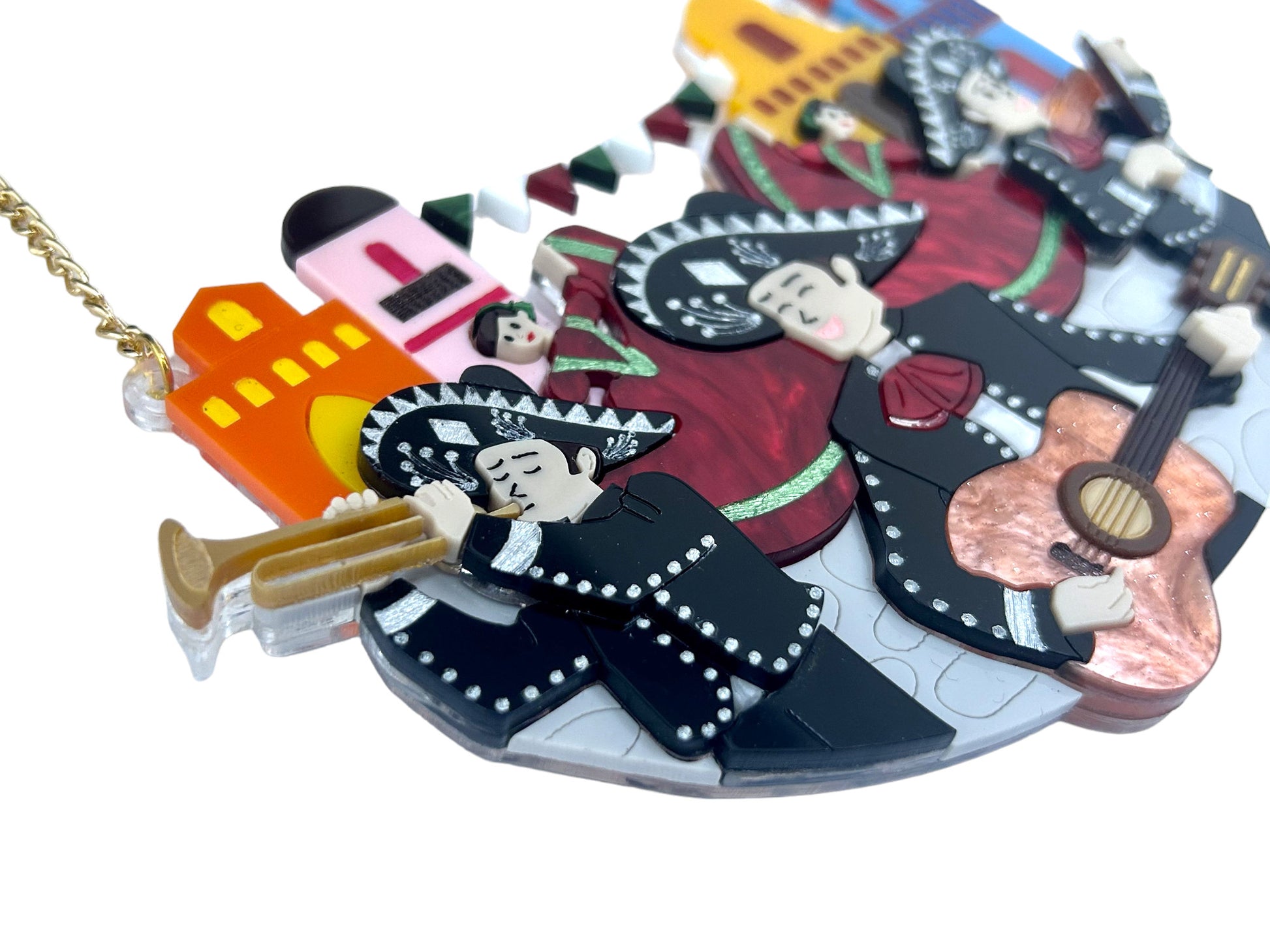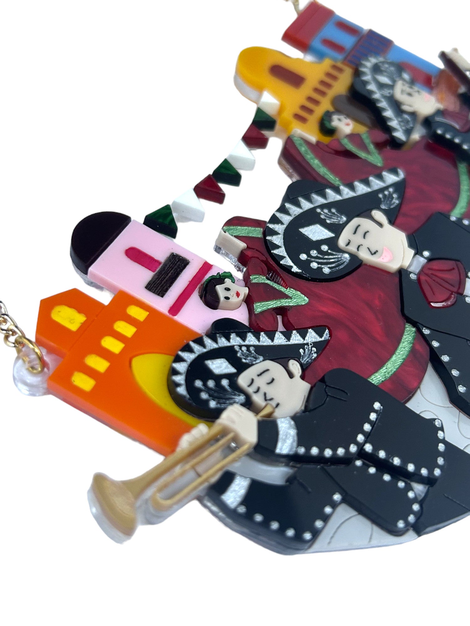 Questa collana è composta principalmente da tre lastre di acrilico/plexiglas, ad esclusione di alcuni dettagli che sono composti da quattro lastre di acrilico (tromba). La base e gli spessori sono trasparenti. Le incisioni sono riempite con colori acrilici. Sono state usate lastre marble rosso e arancione.