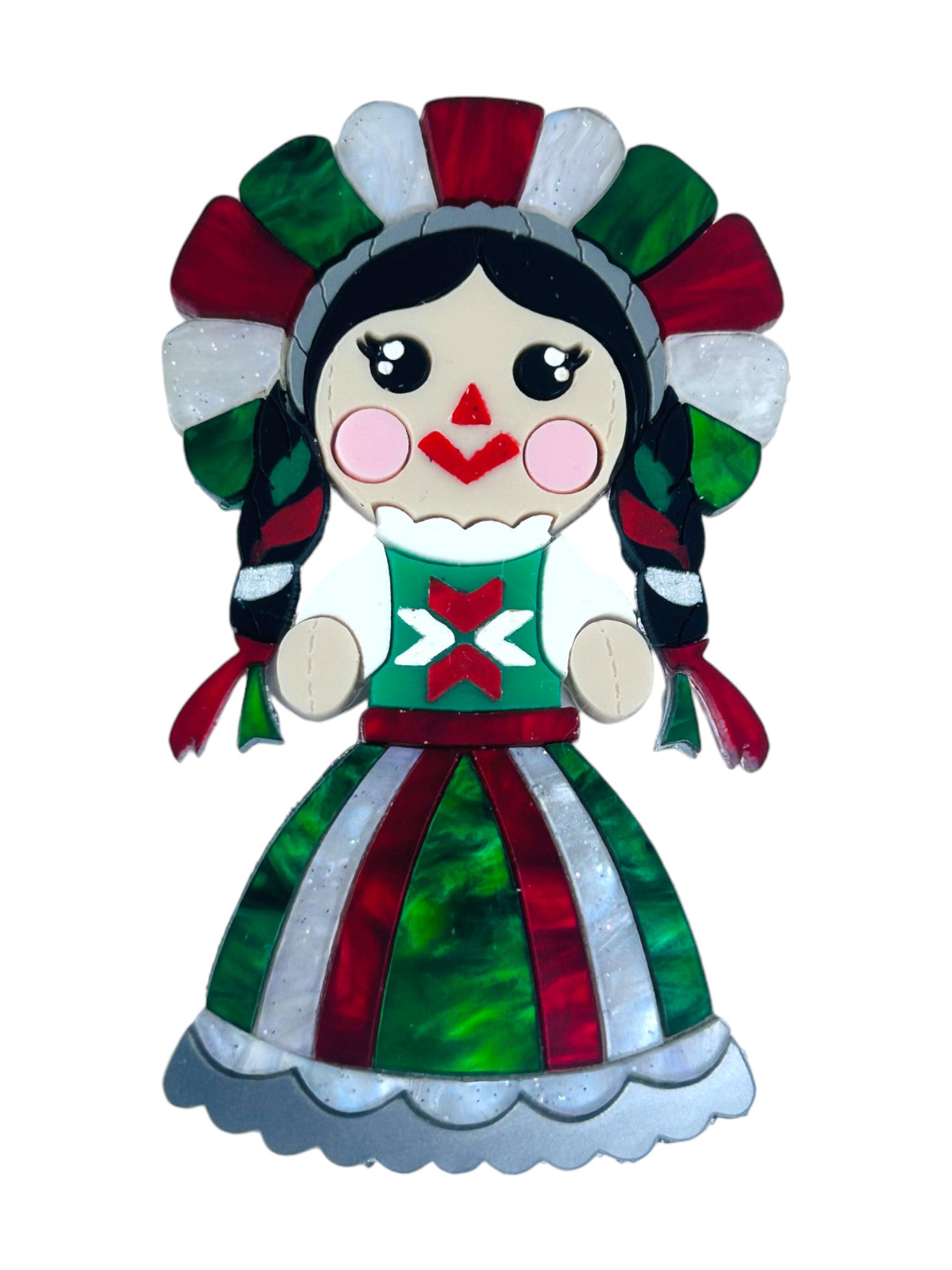 Questa spilla è composta da due lastre di acrilico/plexiglas, con dettagli in marble bianco, rosso e verde. La base è trasparente. Le incisioni sono riempite con colori acrilici. Disponibile anche in versione orecchini a questo link: