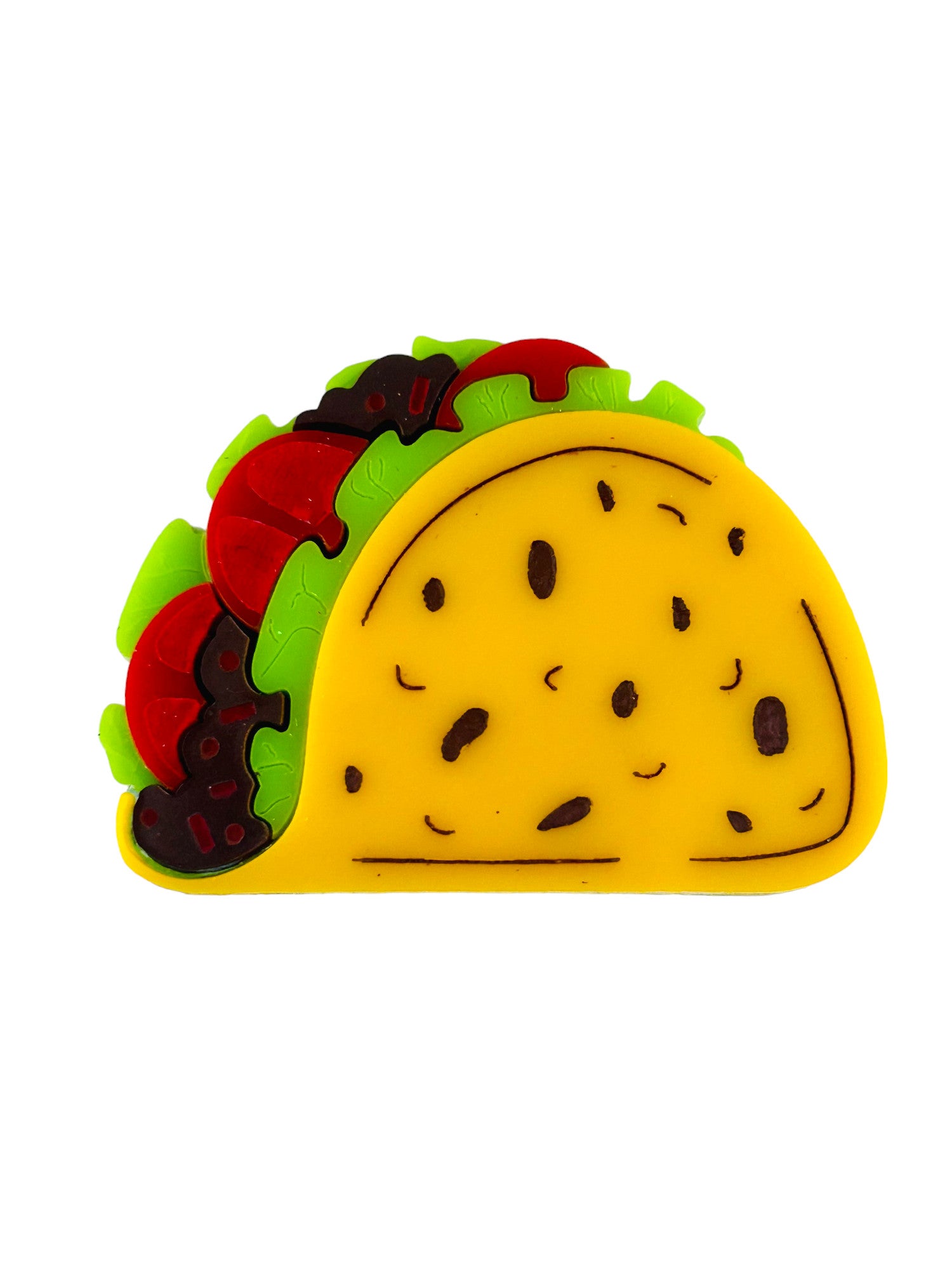 Questa spilla è composta da tre lastre di acrilico/plexiglas. La base e gli spessori sono in acrilico verde. Le incisioni sono riempite con colori acrilici. Sono disponibili anche dei mini tacos in versione orecchini a questo link: