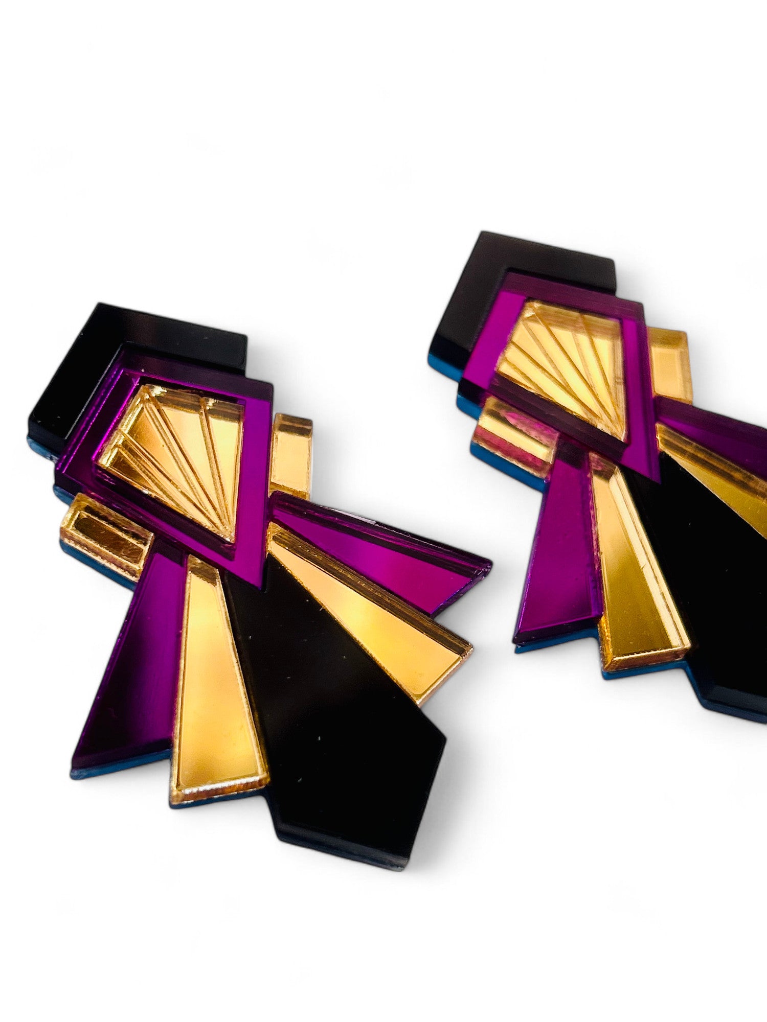 Questi orecchini sono composti da due lastre di acrilico. La base è trasparente. Le incisioni sono riempite con colori acrilici. Per alcuni pezzi sono state usate lastre di acrilico specchiato. Prossimamente aggiungeremo nuovi colori e nuovi modelli, perciò teneteli d'occhio :)