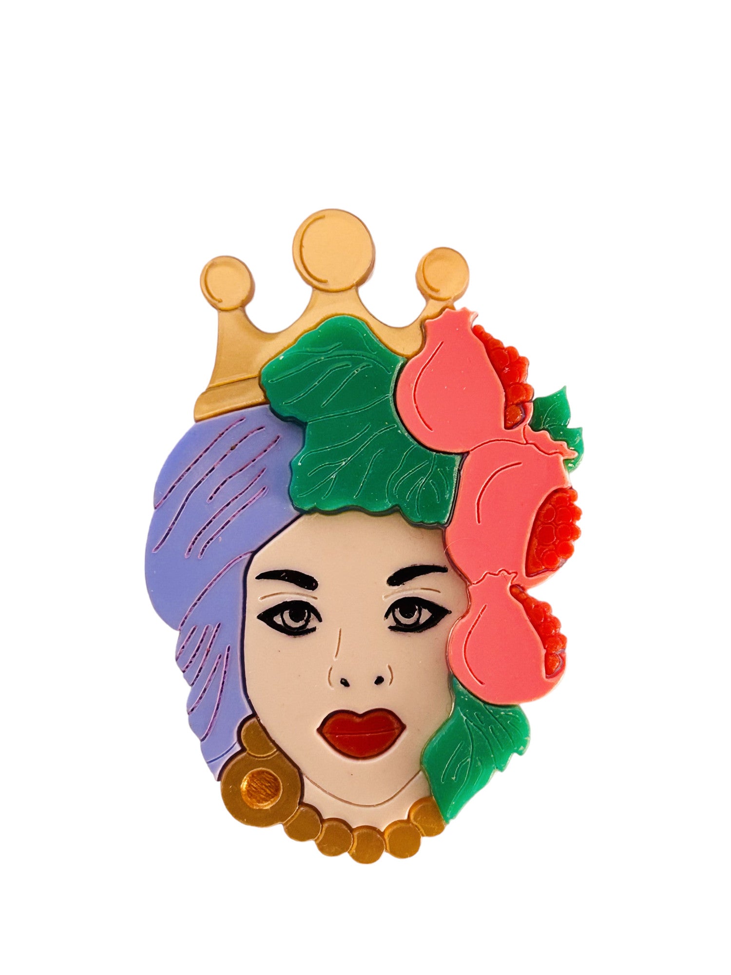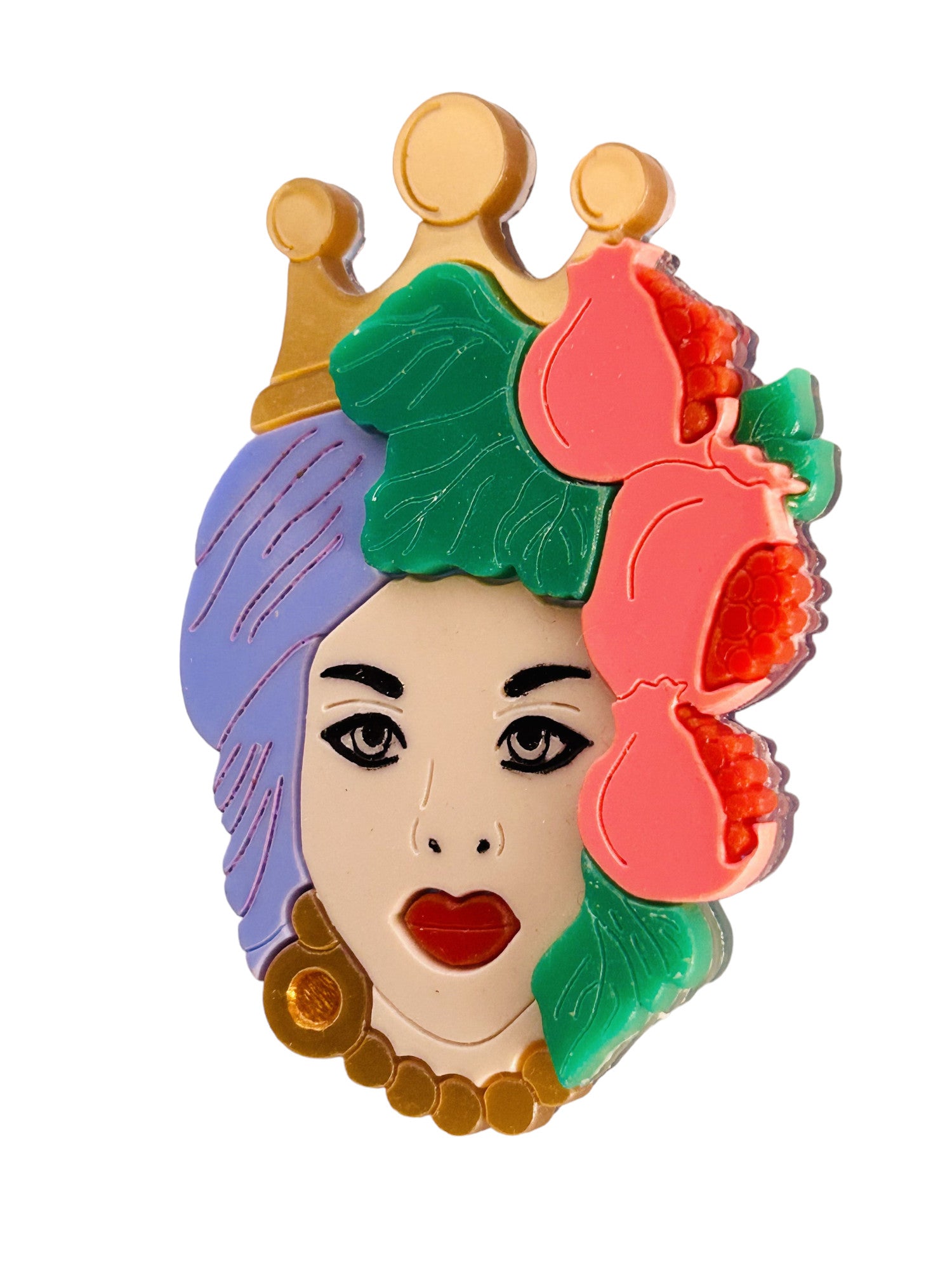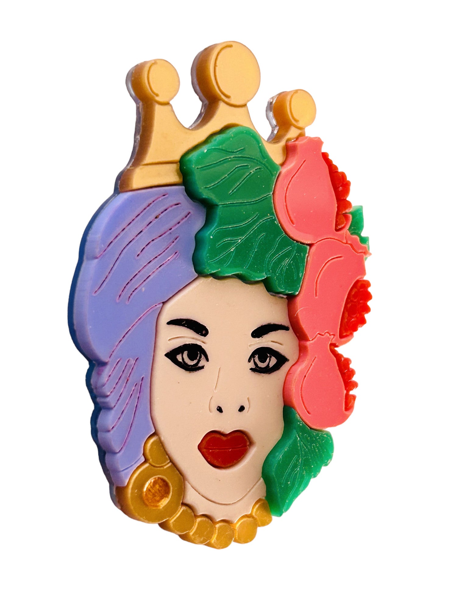 Questa spilla è composta da tre lastre di acrilico/plexiglas. La base è trasparente. Le incisioni sono riempite con colori acrilici.